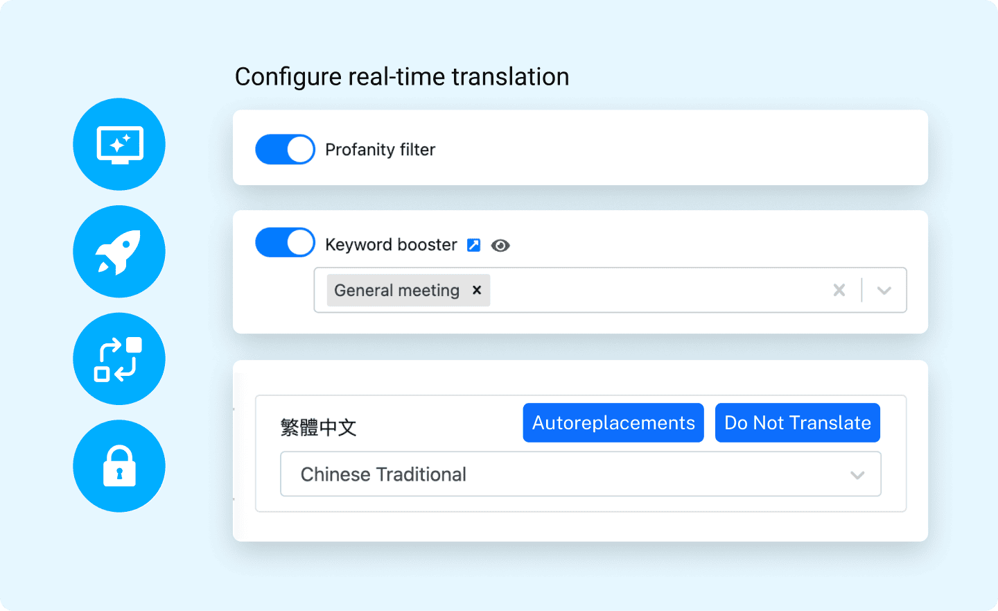 Vocabulary fine-tuning: Keyword boosting, autoreplacements, profanity filters, and Do Not Translate enable you to fine-tune spf.io’s speech recognition and translation to your vocabulary. All tools come with every spf.io account.